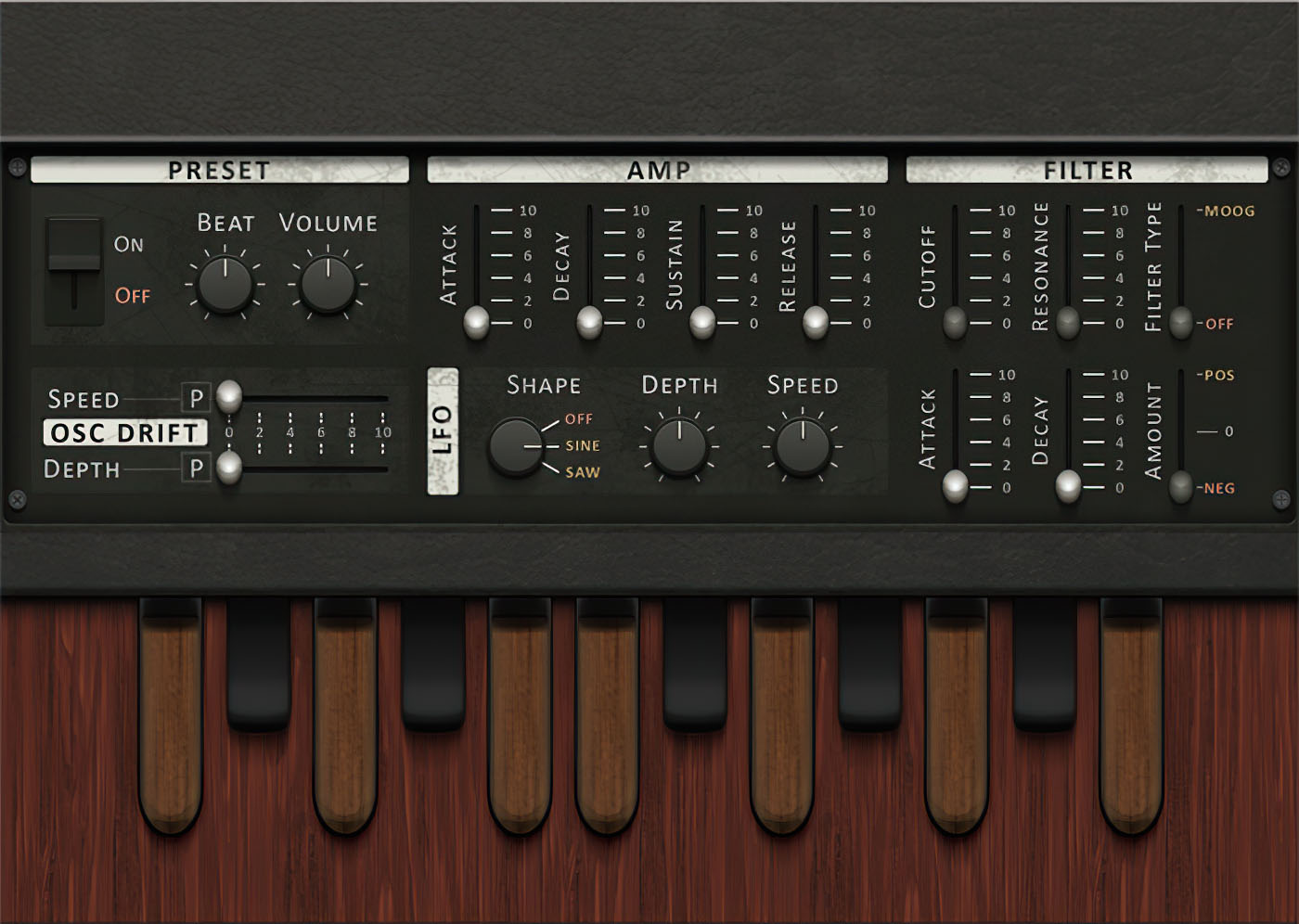 Design mode boasts two analogue oscillators (each with switchable saturated waveforms, one switchable sub oscillator, noise source and oscillator unison modes; capturing the essence and character of the original instrument.