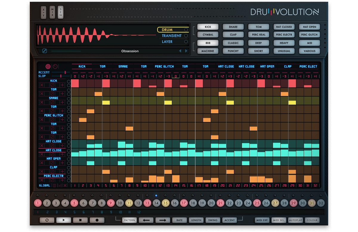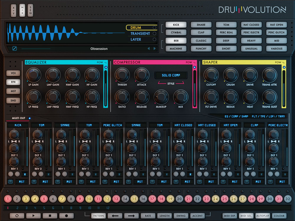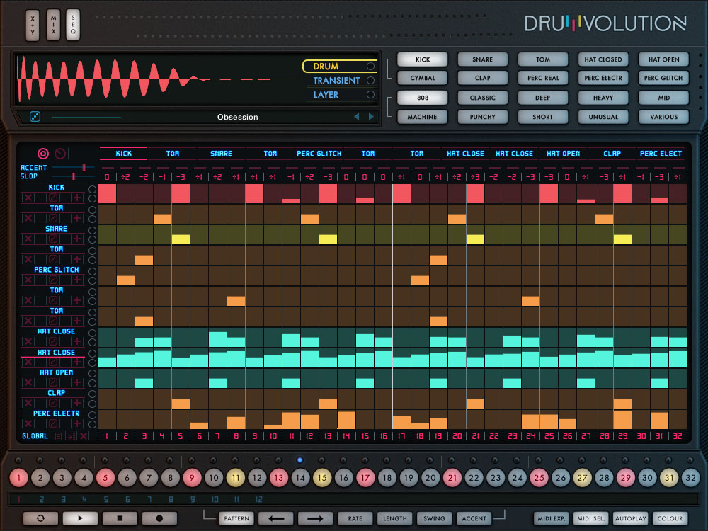 Drumvolution integrates seamlessly with your DAW, boasting a compelling workflow that will change the way you create. The user interface has been designed with both the producer and live musician in mind. Tempo sync is automatic and exporting a sequences’ MIDI data to your sequencer is simple via Drag and Drop.