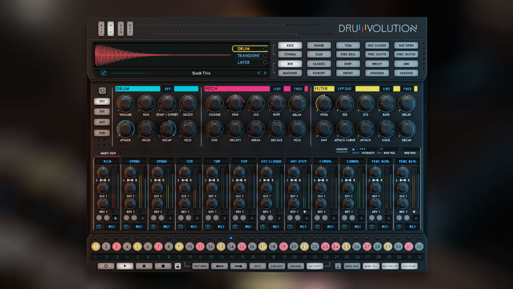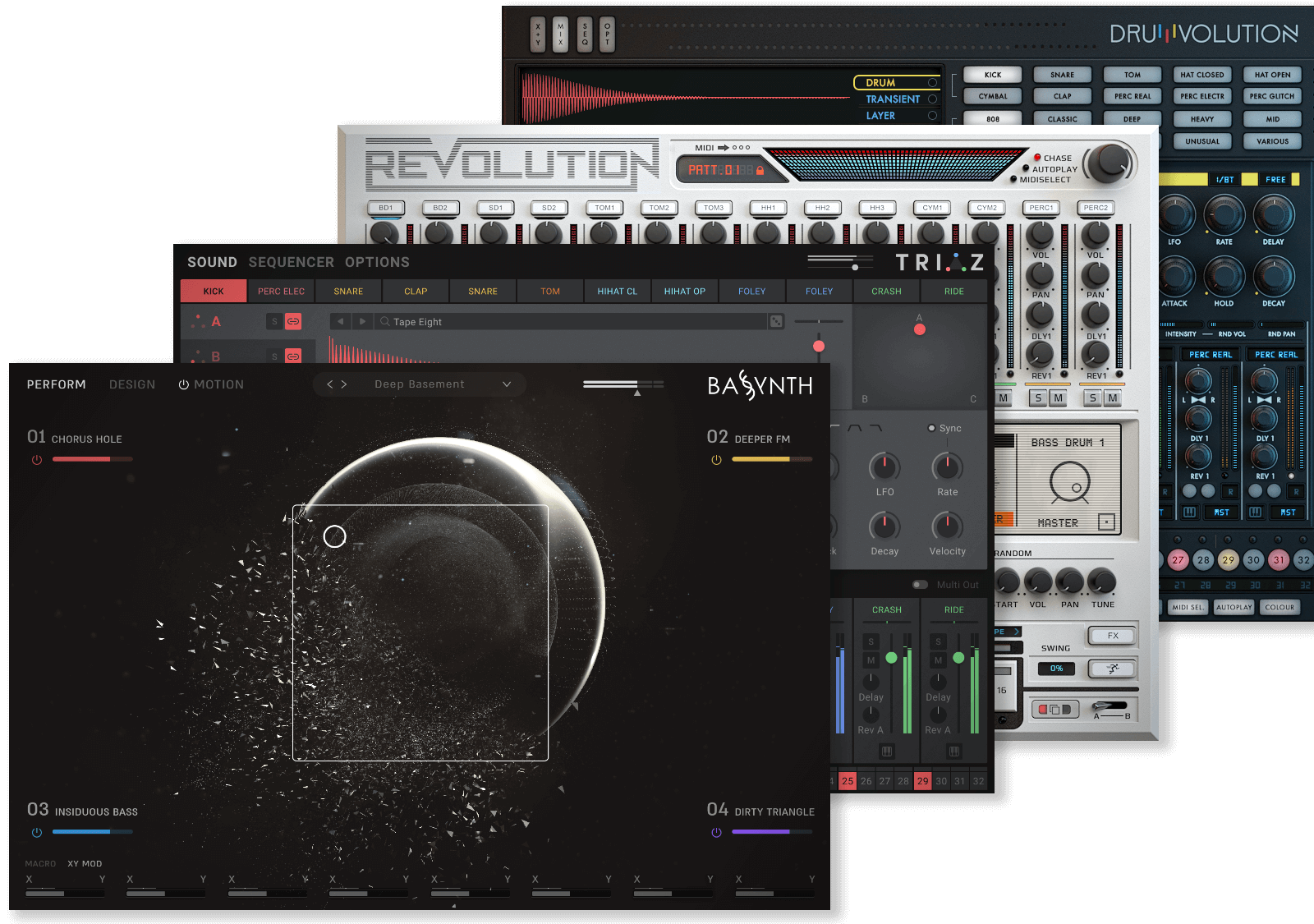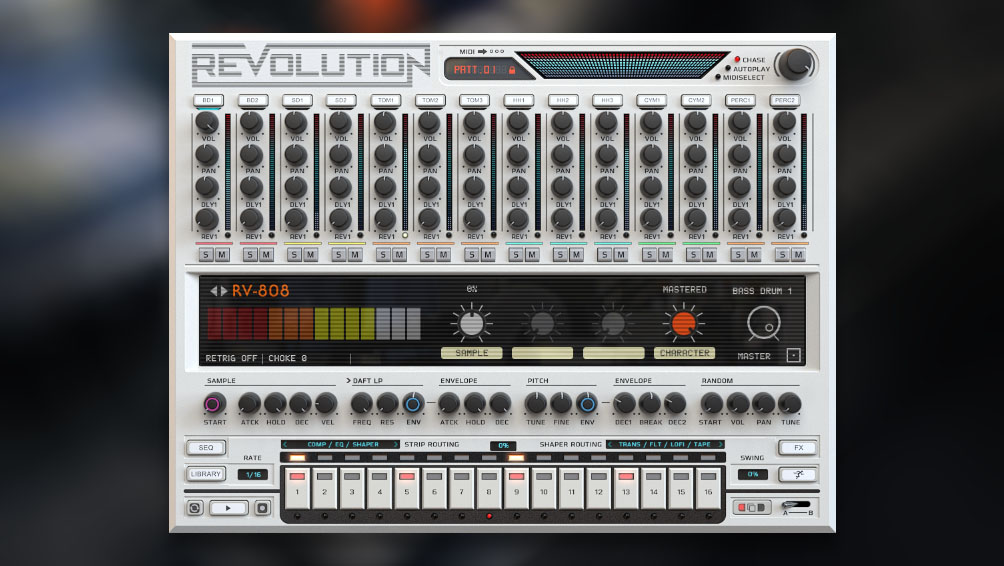 Revolution is a living and breathing instrument. Just like hardware drum machines you can change the analog character and tone in real time without ever repeating the same sound twice.